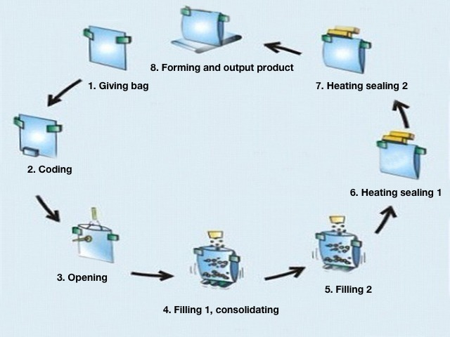 Արագություն 10-35 տոպրակ/րոպե (արագությունը կախված է արտադրանքի կարգավիճակից և լցման քաշից)) Քաշ 1400 կգ 1520 կգ 1580 կգ 1650 կգ Լարման 380V 3 փուլ 50HZ/60HZ Ընդհանուր ուժը 2KW 2.2kw 2.5kw 2.5kw Սեղմել օդը 0.8 մ3/ րոպե (մատակարարում օգտագործողի կողմից) 8 բար Արտադրանքի գործընթաց
